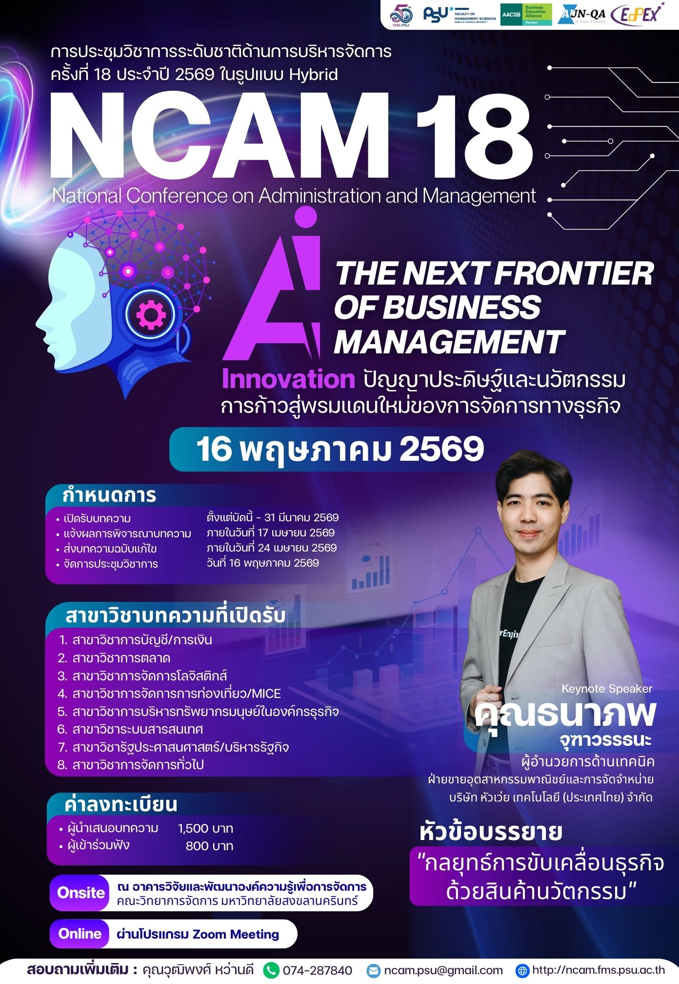 คณะวิทยาการจัดการ มหาวิทยาลัยสงขลานครินทร์ เล็งเห็นถึงความสำคัญของการสร้างองค์ความรู้และการแลกเปลี่ยนประสบการณ์ในเรื่องดังกล่าว จึงได้จัดโครงการประชุมวิชาการระดับชาติด้านการบริหารจัดการ ครั้งที่ 18 ประจำปี 2569 ขึ้น ภายใต้หัวข้อ “AI, Innovation: The Next Frontier of Business Management (ปัญญาประดิษฐ์และนวัตกรรม: การก้าวสู่พรมแดนใหม่ของการจัดการทางธุรกิจ)” โดยมีวัตถุประสงค์เพื่อเป็นเวทีทางวิชาการสำหรับนักวิชาการ นักวิจัย นักศึกษา ผู้ประกอบการ และผู้บริหารองค์กร ได้เผยแพร่ผลงานวิจัย แลกเปลี่ยนองค์ความรู้ แนวคิด และประสบการณ์เกี่ยวกับการประยุกต์ใช้ AI และนวัตกรรมในการจัดการธุรกิจในมิติต่าง ๆ อันจะนำไปสู่การพัฒนาการบริหารจัดการองค์กรอย่างมีประสิทธิภาพและยั่งยืน